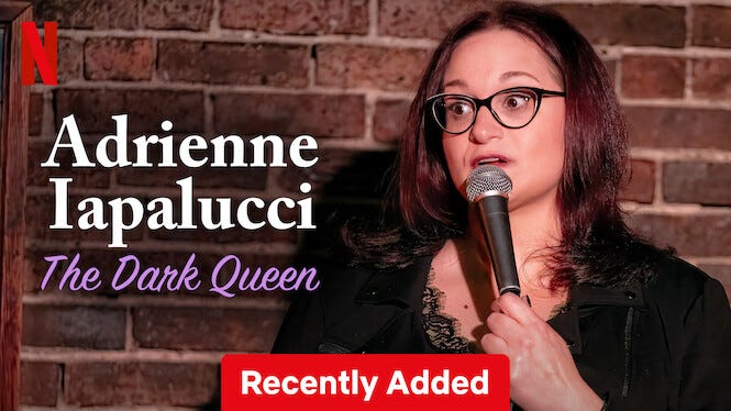 This is BIG! I think I might have discovered an actual Terf comedian/comedienne who dares to make jokes about Trans in actual public — and on Netflix, no less. Her name is Adrienne Iapalucci and her show ‘The Dark Queen’ has just ‘dropped’ and is a must watch for all Terfs. She is hilariously funny on Trans and many other taboo subjects.